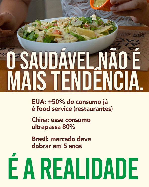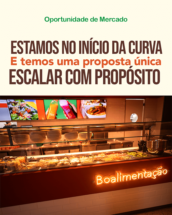O Food Service vive uma GRANDE ONDA de crescimento. No Brasil cresceremos 4 a 5 vezes nos próximos anos. No mundo, há redes de alimentação saudável nos moldes da Boali avaliadas em US$ 1 BILHÃO de dólares em 2025. Temos MODELOS DE NEGÓCIO validados há quase 2 décadas e PRONTOS PARA ESCALAR no mercado wellness de alimentação.