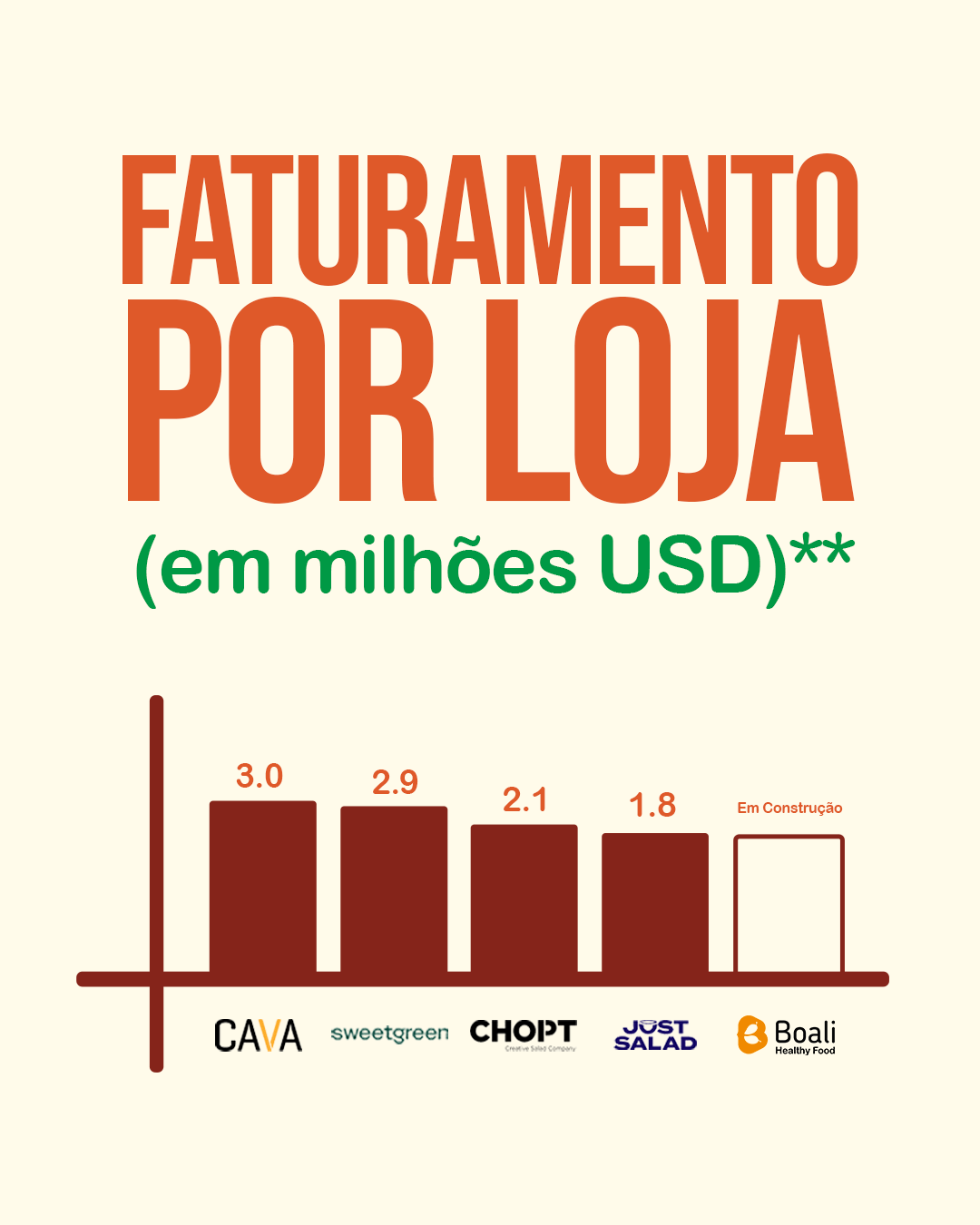 Com base nessa jornada, estruturamos um comparativo detalhado entre Boali e players como Sweetgreen, CAVA, Just Salad e outros. A média de faturamento por loja desses players gira entre US$ 2 e 3 milhões anuais, com tickets médios entre US$ 11 e US$ 24.