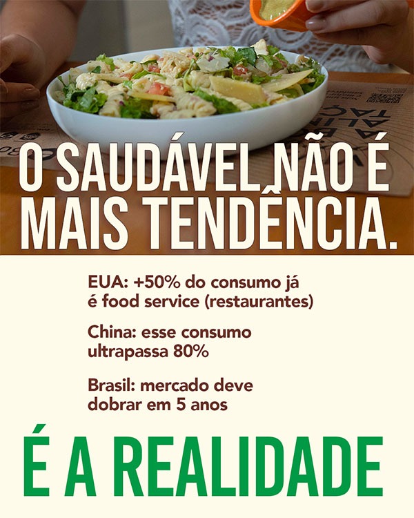 Nos EUA, mais de 50% do consumo alimentar já acontece no food service (restaurantes). Na China, esse número ultrapassa 80%. No Brasil, todas as projeções apontam que esse mercado dobrará nos próximos cinco anos.